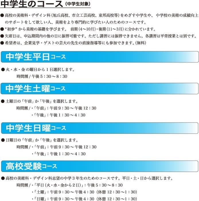 高校の美術科志望や、美術に関心がある中学生の為のコースです。 |