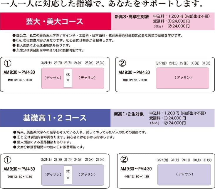 愛知県立芸術大学など国公立・私立の美術系大学を受験する人の為のコースです。 |