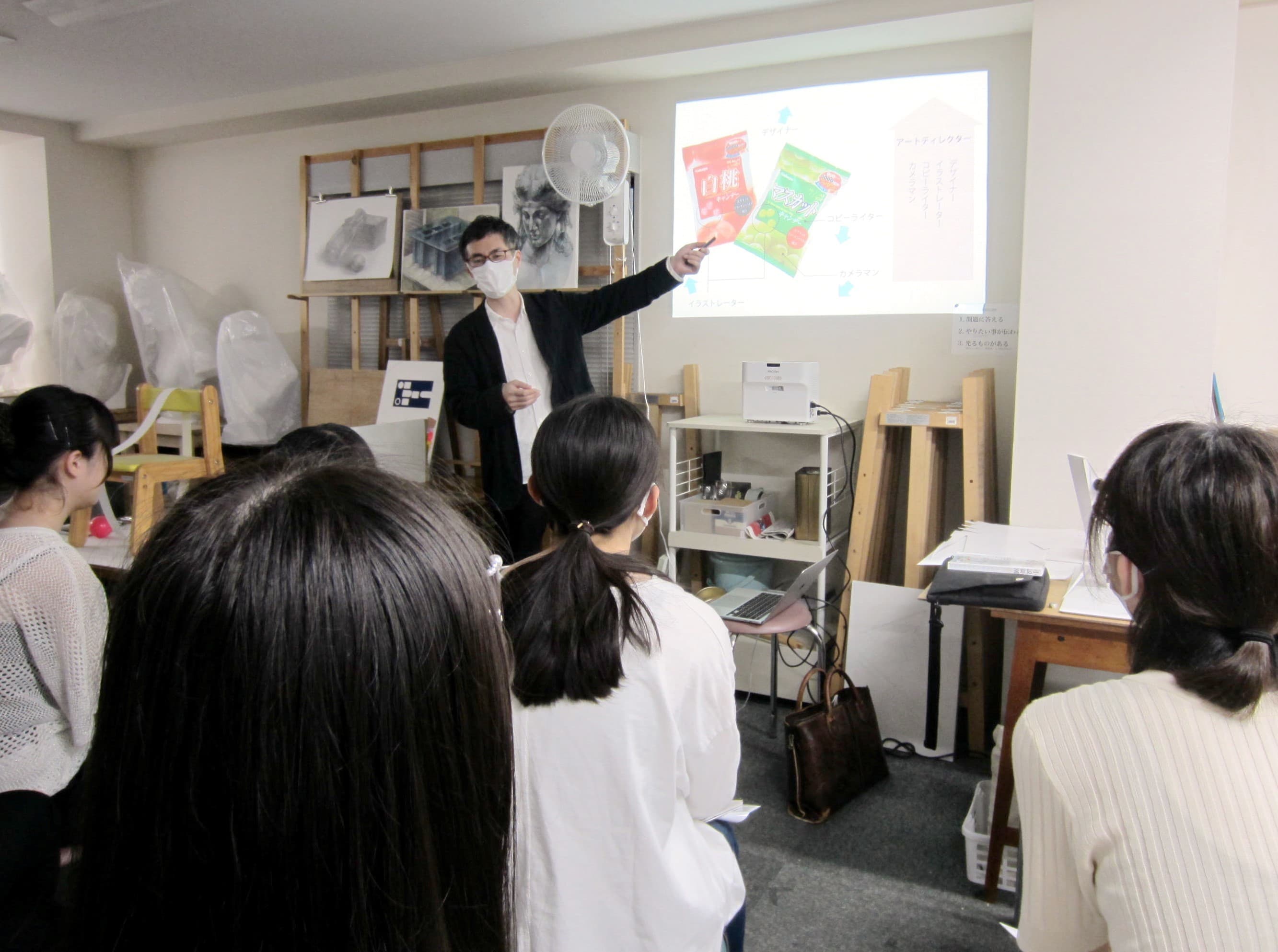 「視覚表現領域・情報表現領域などの授業や入試について」「デザインとイラストの仕事について」のプロジェクターを使った具体的なお話と、質疑応答、更に生徒の作品の講評もあり大変参考になりました。